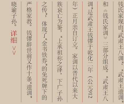 每當散步走過緊鄰西湖的錢王祠,看到絡繹的游人和錢氏后裔前來瞻仰祭祀,心里總有莫名的感慨。國人有為祖先或先賢立祠的傳統,但走遍大江南北,像錢王祠這樣屹立千年不倒、至今香火不絕的實為罕見。這是吳越錢王的榮耀,而同時,它也是《錢氏家訓》得以流傳千年、影響深遠的一個重要載體。詳細